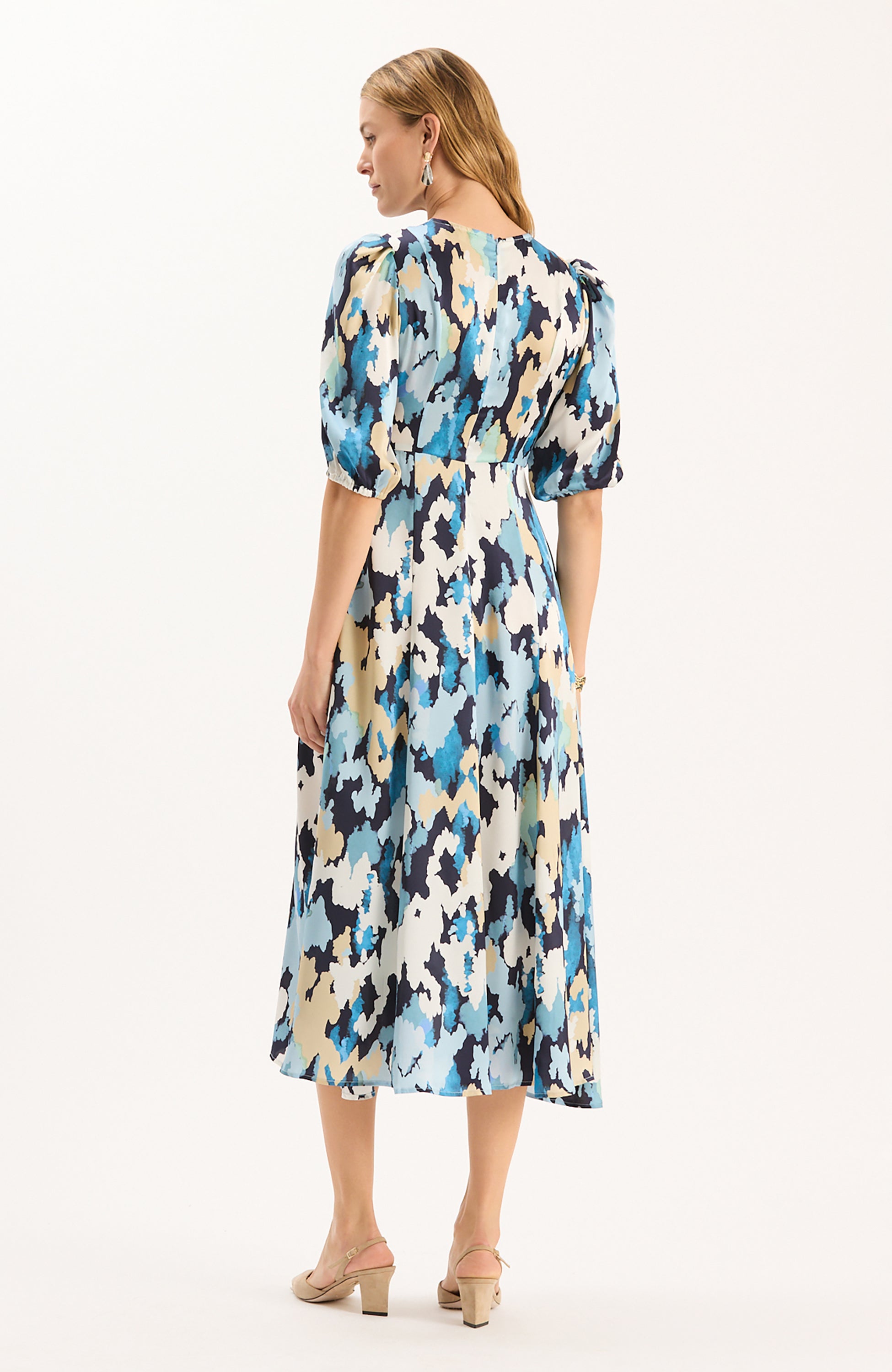 This midi blends everyday elegance with a playful touch, crafted in 100% silk with a bold print for a pop of color. The silhouette features a round neckline, puffed elbow-length sleeves, and a softly flared midi hem for a flattering, feminine finish. Effortless yet eye-catching, this piece transitions seamlessly from daytime outings to evening occasions.