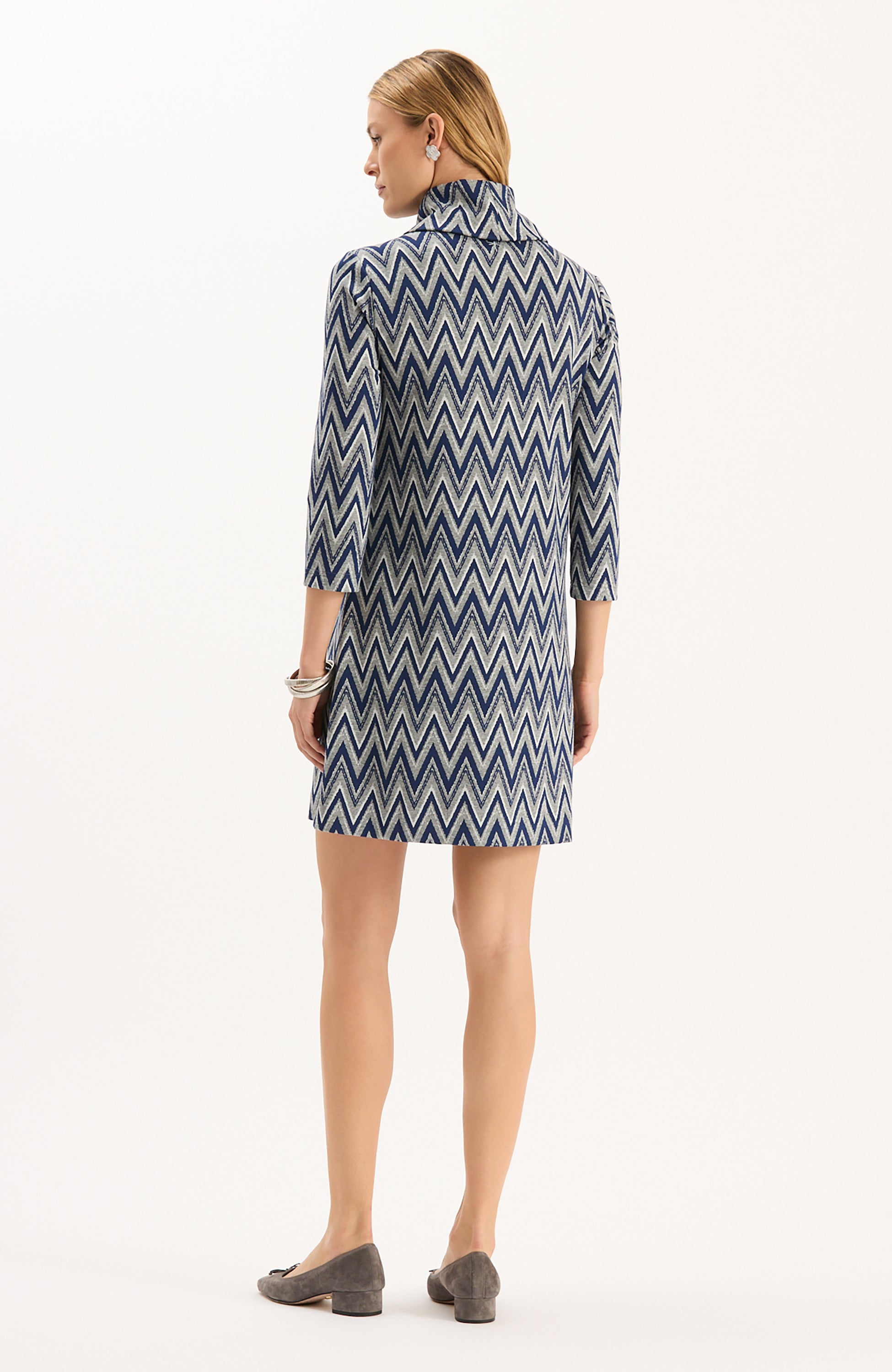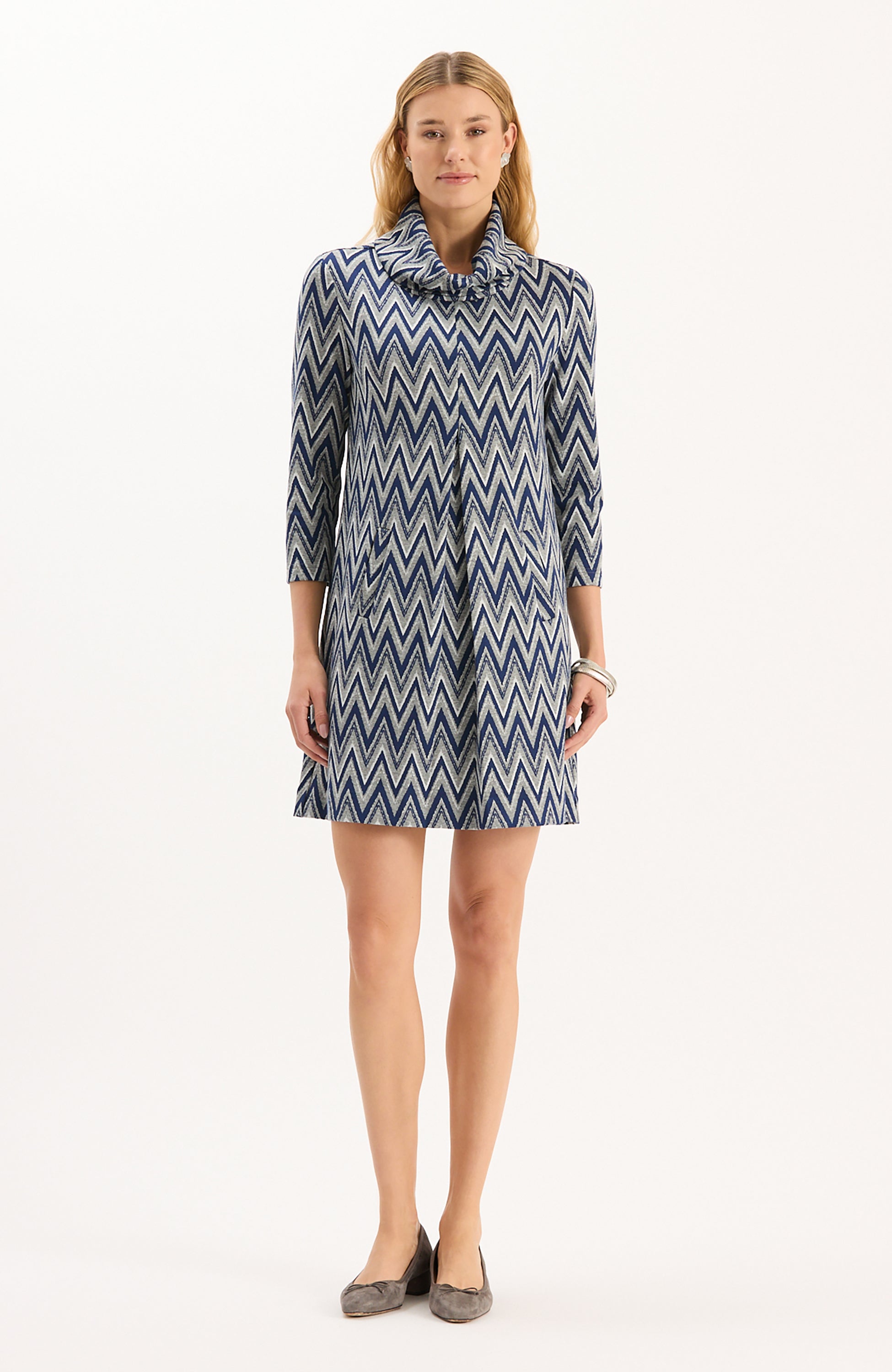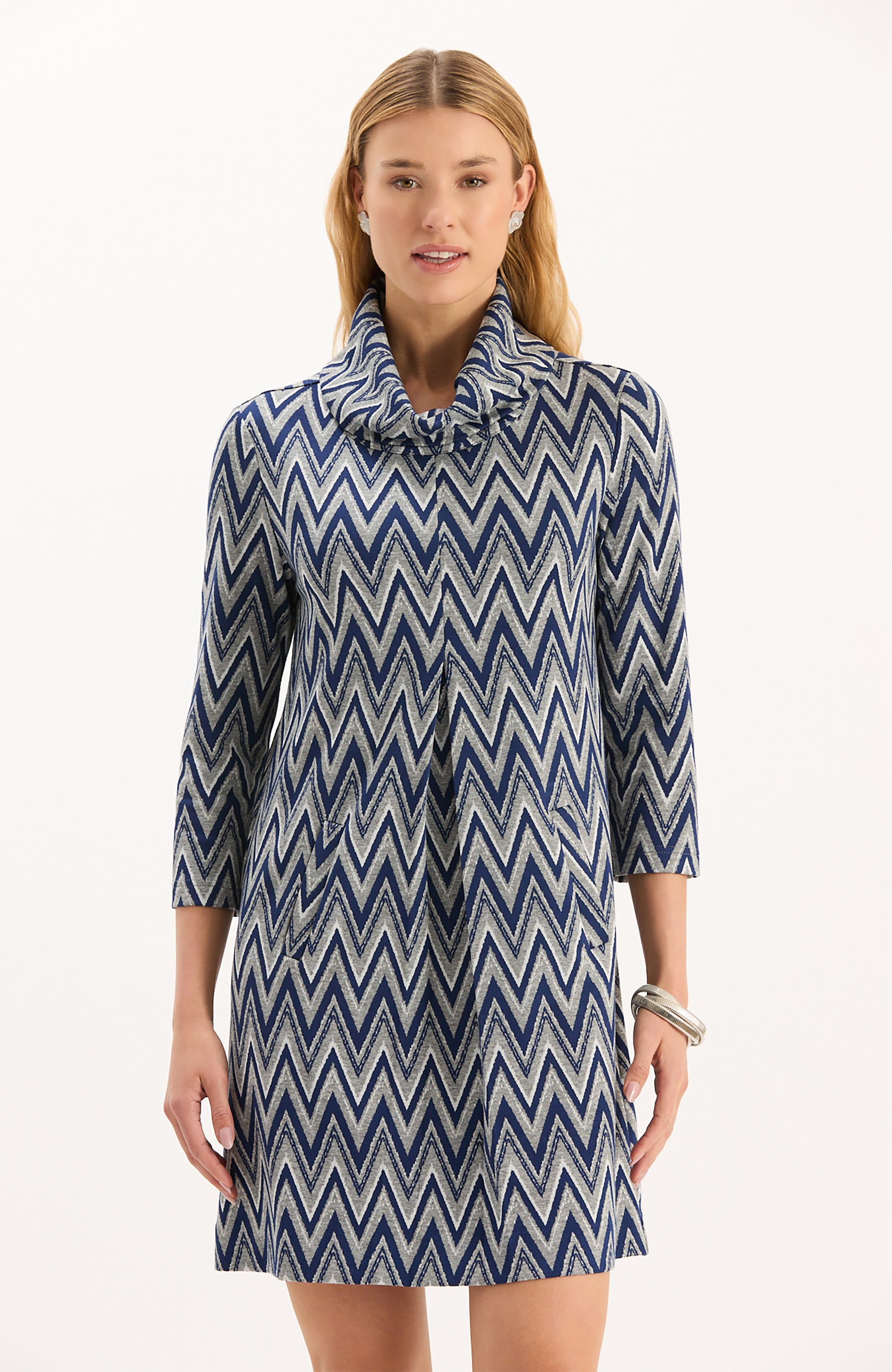 Our #1 best-selling dress, Kim is a must-have for fall. Classy and cozy with a chic cowl neck, made in our signature, wrinkle-free knit fabric. Whether you dress her up or down, Kim is an easy throw-on-and-go. Featured here in a classic chevron pattern, perfect for the fall and winter seasons.
