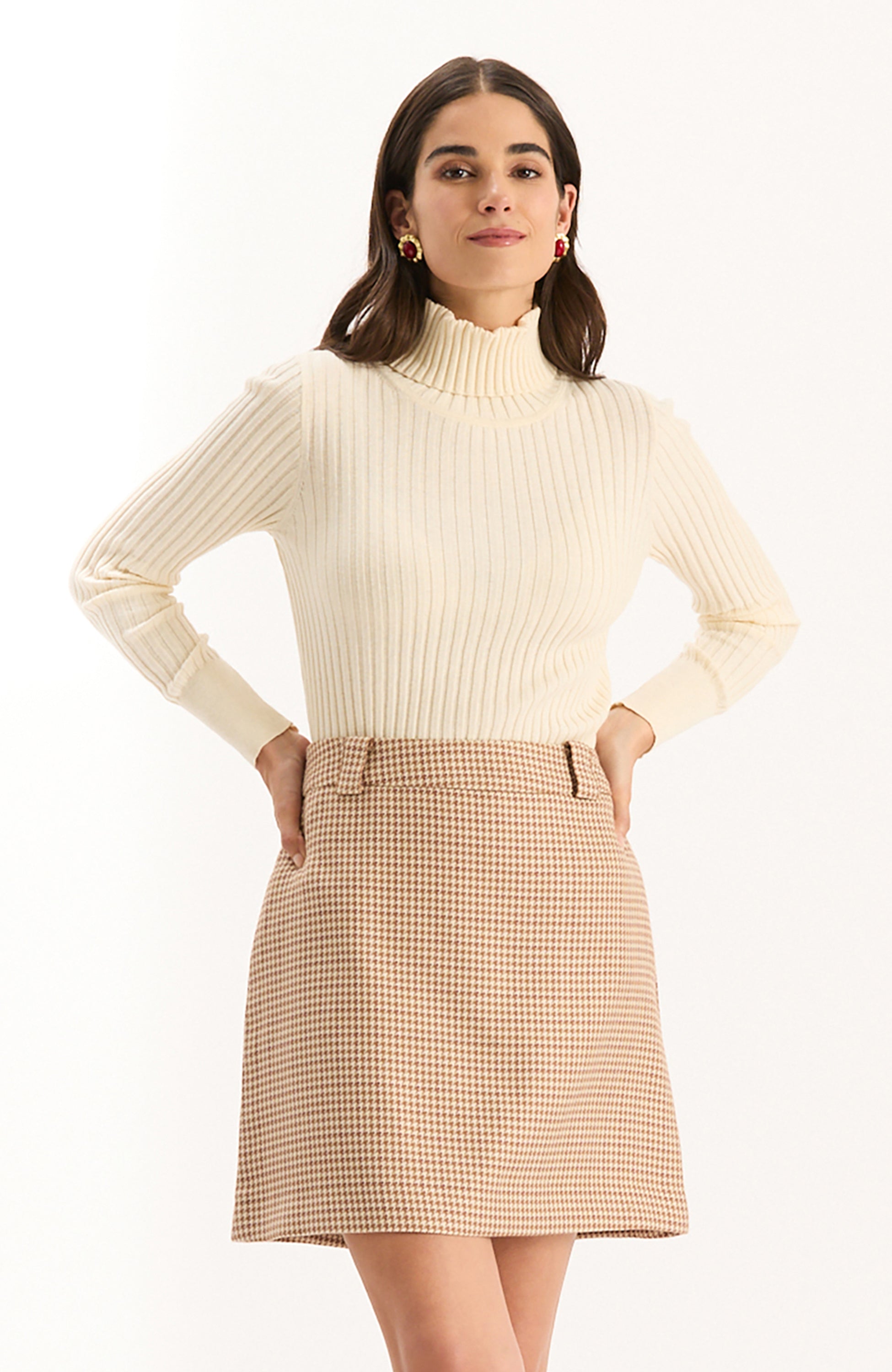 The Twiggy Houndstooth Skirt features a timeless houndstooth print bringing 70's vintage-inspired charm to modern wardrobes. It has a high-waisted fit and an A-line shape that creates a polished and flattering look. Versatile and chic, this piece moves effortlessly from office to weekend and pairs beautifully with blouses, chunky knits, sleek turtlenecks, or can be worn as a set with the matching Taylor Houndstooth Blazer.