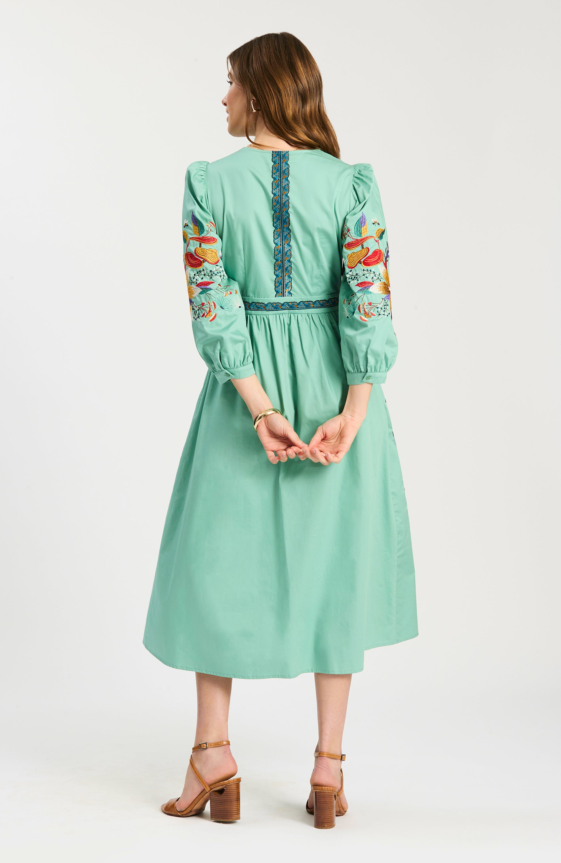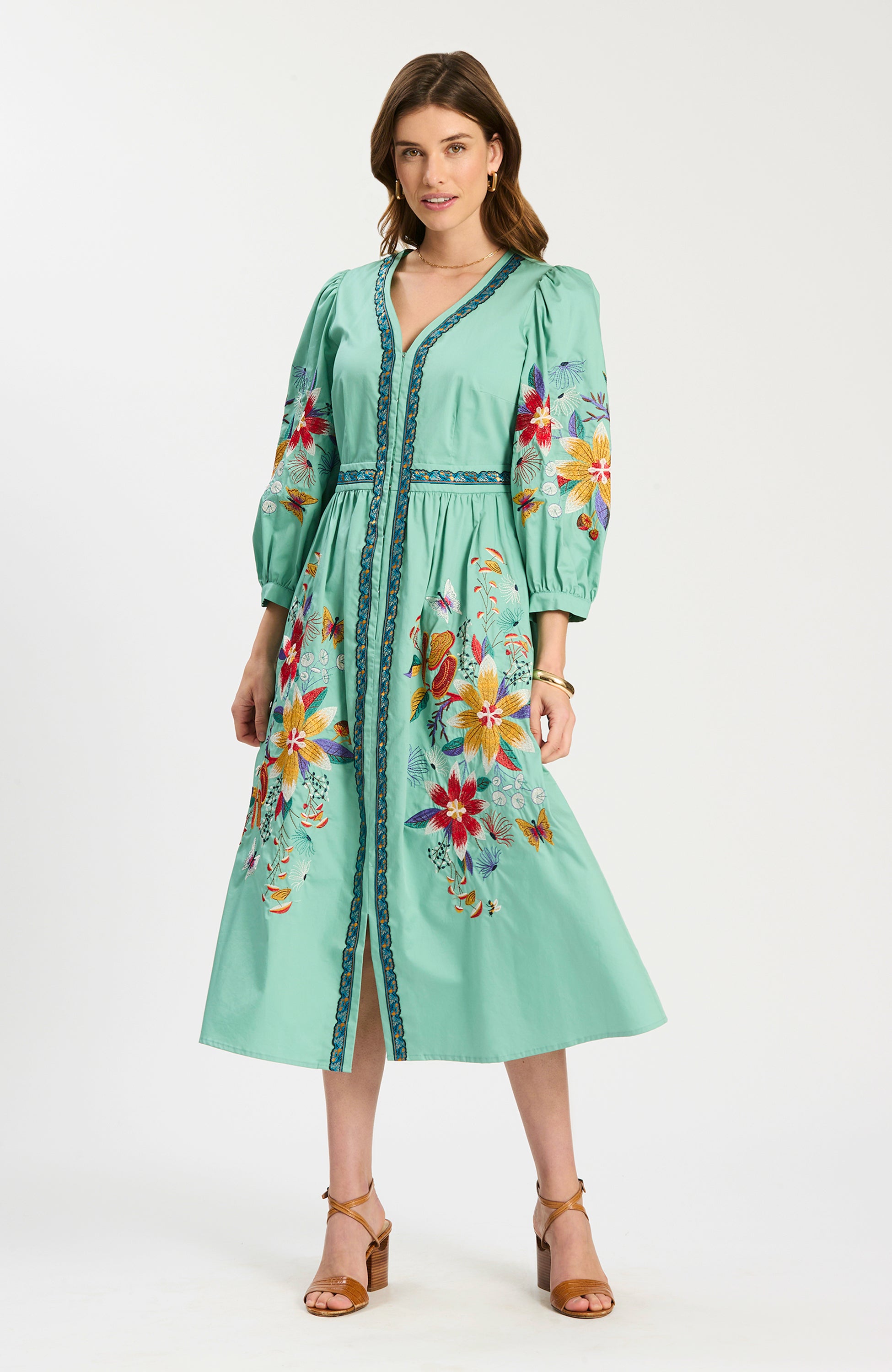 This beautifully detailed midi dress is a true statement piece, designed to feel special yet effortless. Set in a soft seafoam hue, it features vibrant floral embroidery that adds color, texture, and a handcrafted feel throughout. The gently structured bodice, flattering waist seam, and flowing skirt create an easy, feminine silhouette, while the long sleeves with subtle volume add an elevated touch. Wear it with sandals for daytime events or dress it up with a heel for dinners and celebrations—this is the kind of dress that turns heads without trying too hard.