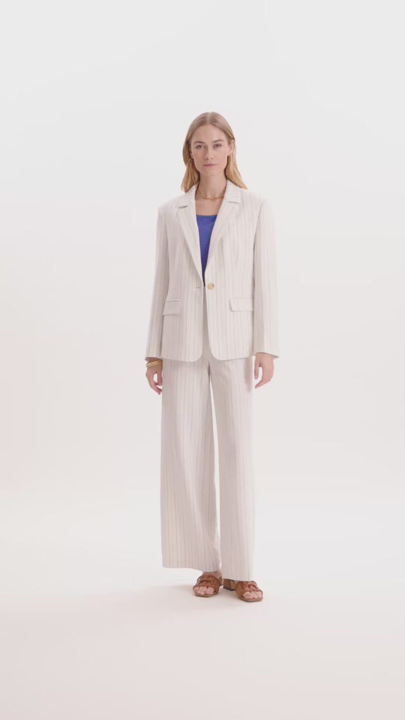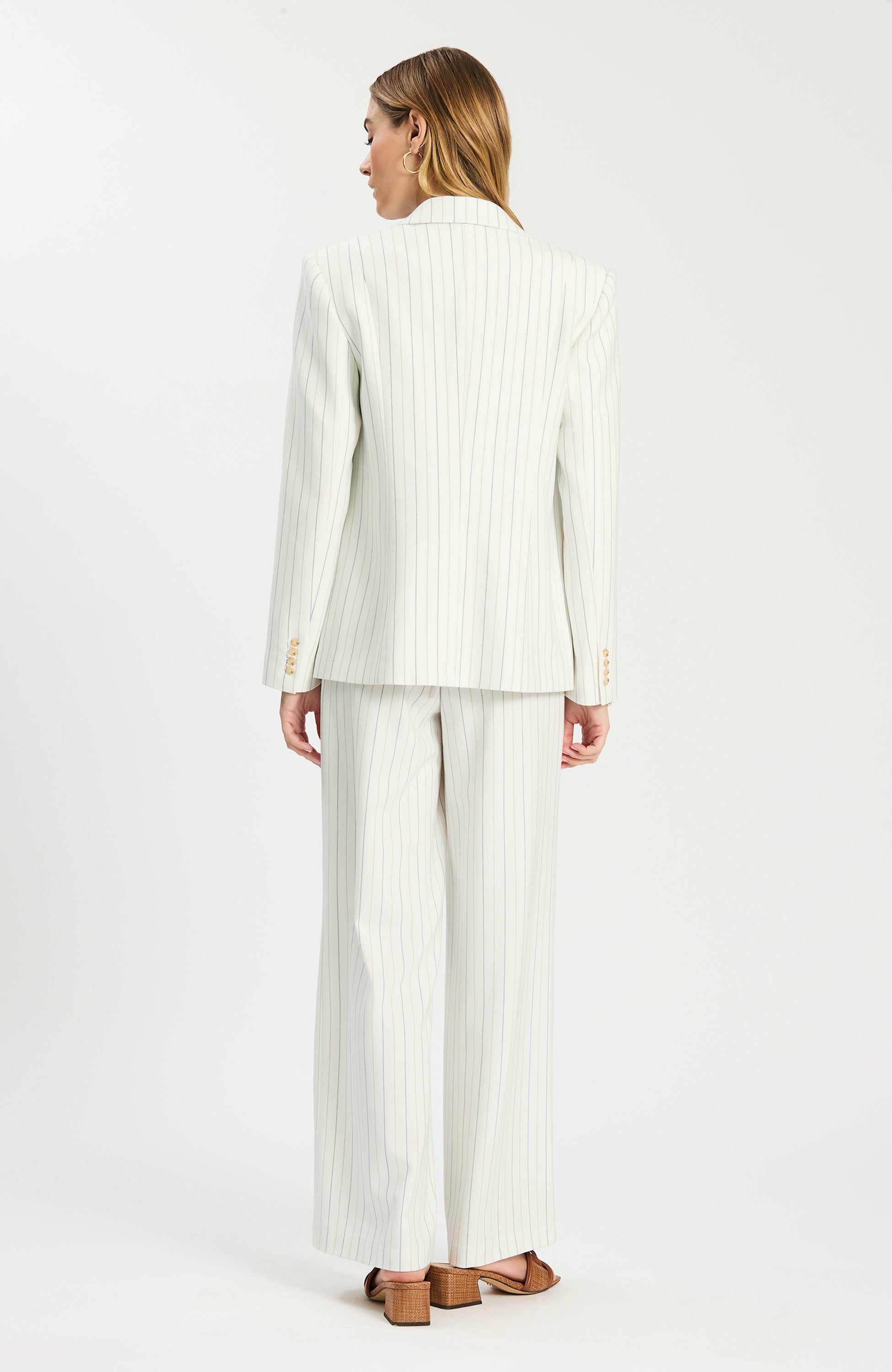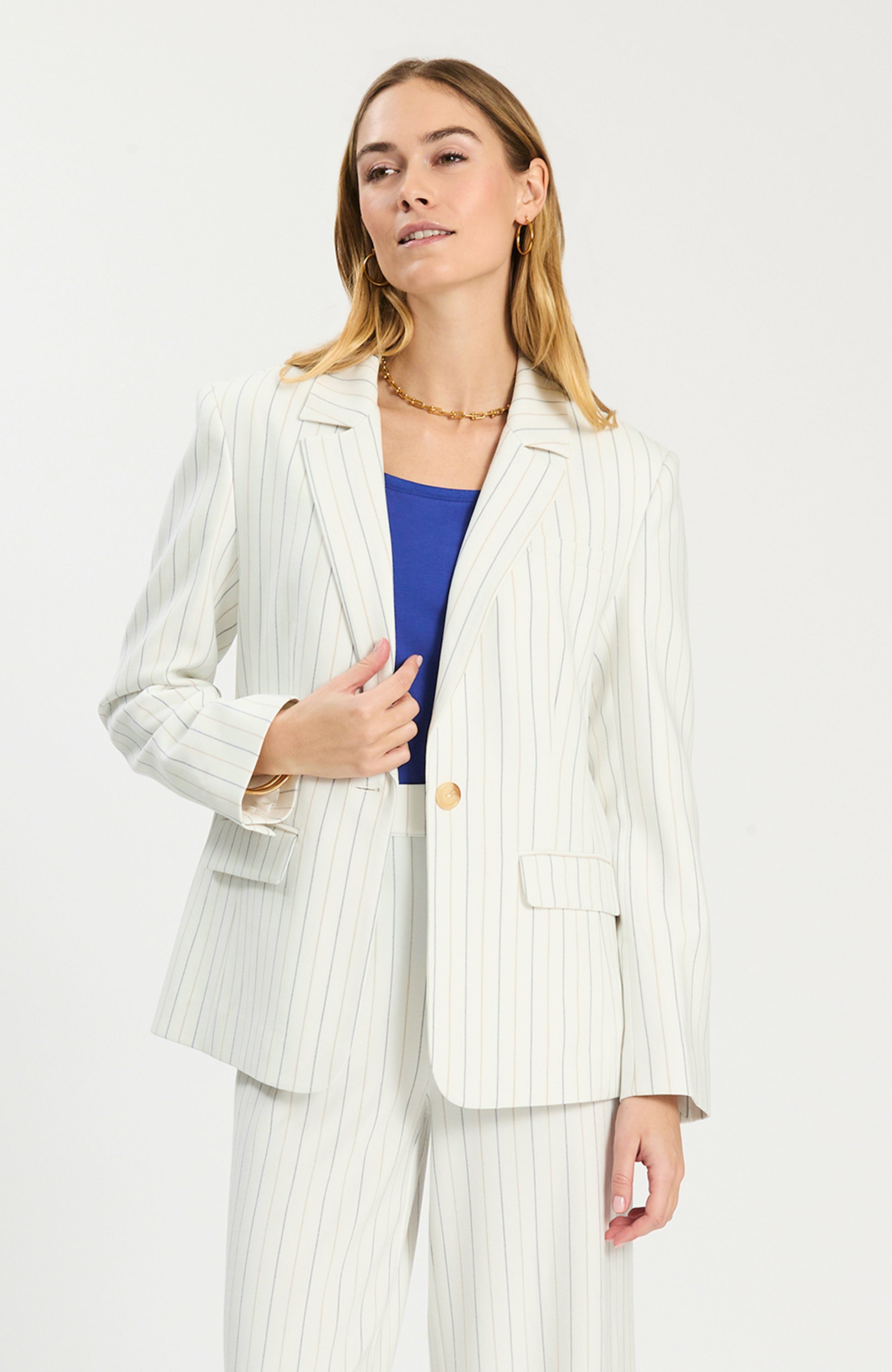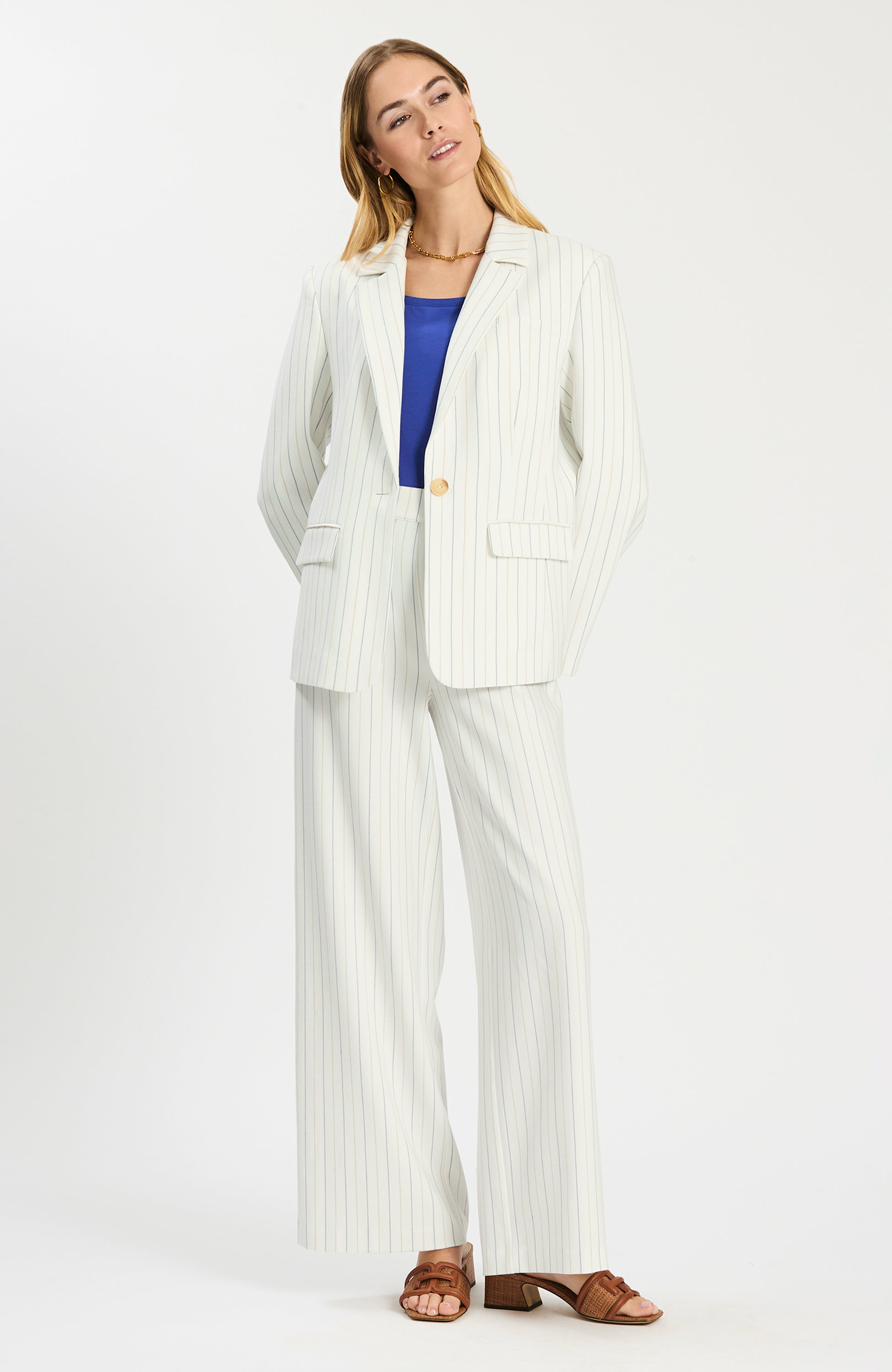 A modern classic with a tailored edge, this ivory pinstripe blazer is designed to elevate every outfit in your wardrobe. Cut with a clean, structured silhouette and finished with subtle vertical stripes, it creates a long, flattering look while still feeling effortless. The single-button closure and sharp lapel keep it timeless, while the soft fabrication allows for all-day wear. Pair it with the matching pant Marilyn Striped Pant for a chic, head-to-toe moment, or layer it over a tee for an easy mix of polished and relaxed.