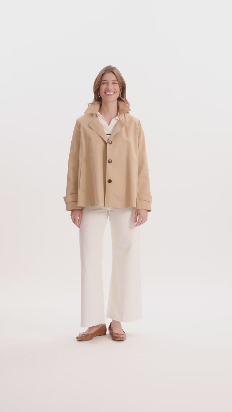 This classic jacket is the definition of effortless outerwear—clean, timeless, and endlessly wearable. Designed in a warm neutral tone, it features a relaxed, boxy silhouette with a structured collar and polished button front for an elevated everyday feel. The lightweight fabrication makes it perfect for layering through the seasons, while the slightly cropped length pairs seamlessly with everything from dresses to tailored pants. Throw it on over a tee or sweater for an easy, pulled-together look that works from morning errands to evening plans.