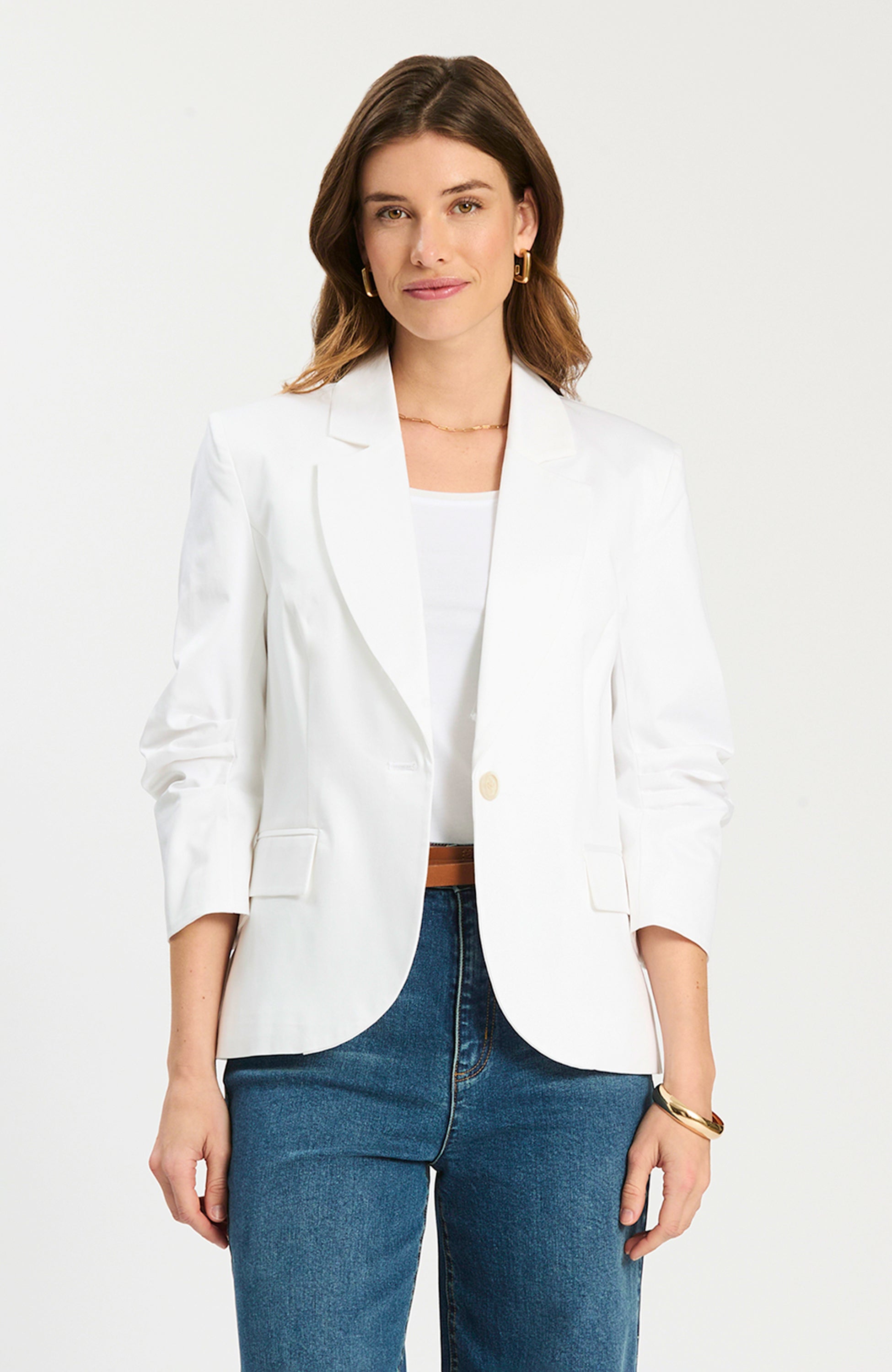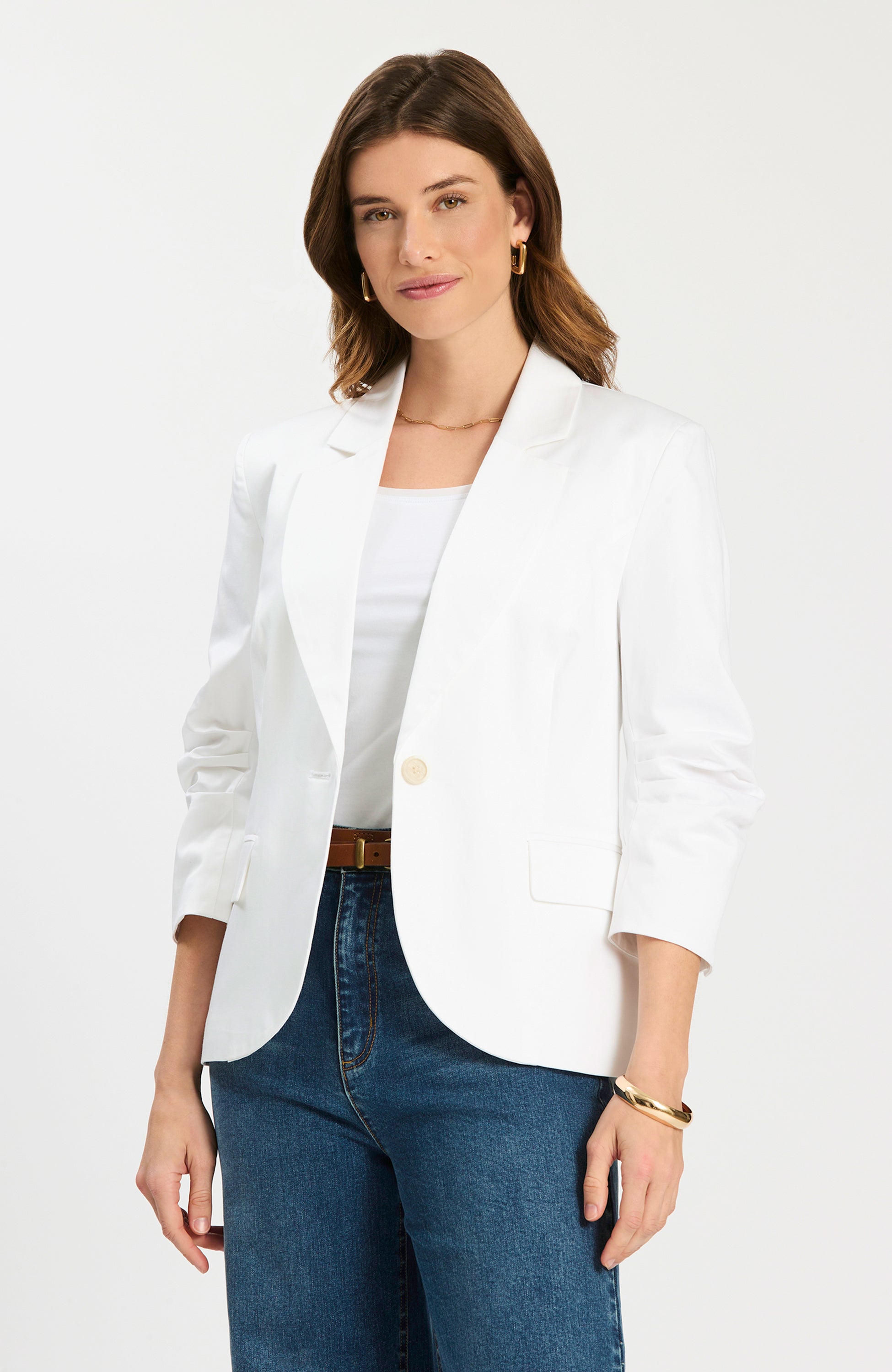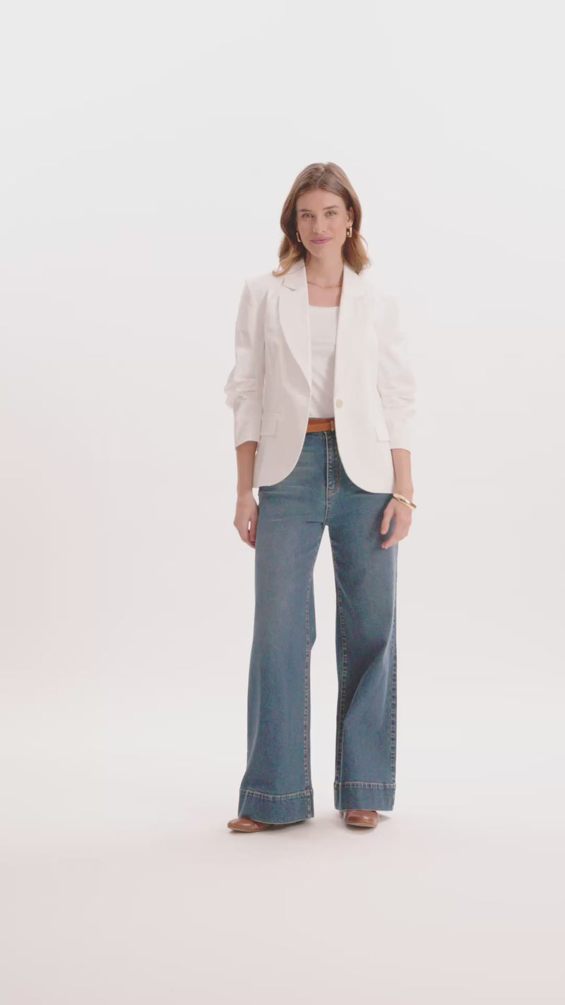 Suit up for spring: the Taylor Blazer brings a classic tailored look with warm-weather ease. Designed with a notch collar, single-breasted button front, and three-quarter ruched sleeves, it layers effortlessly over tees, dresses, and everything in between.