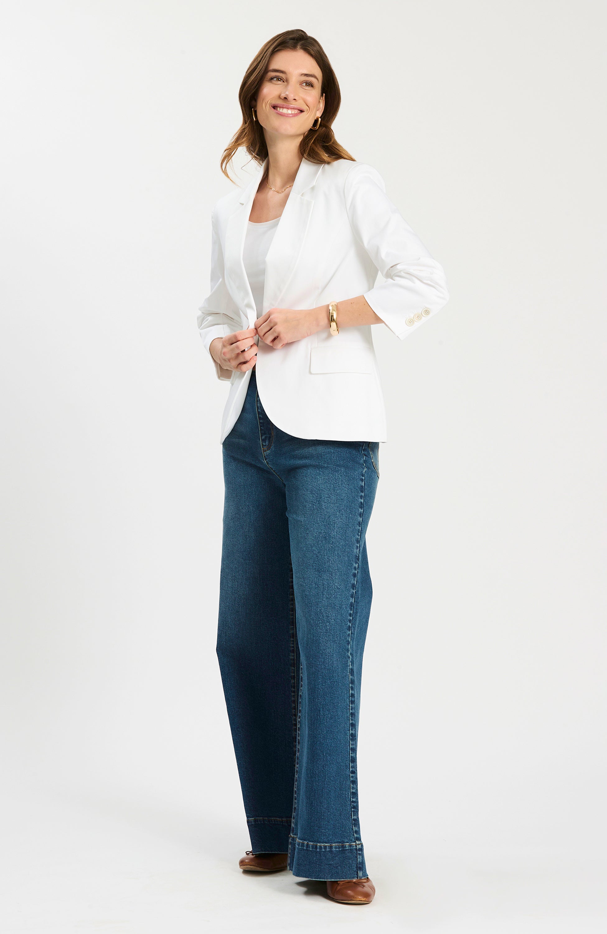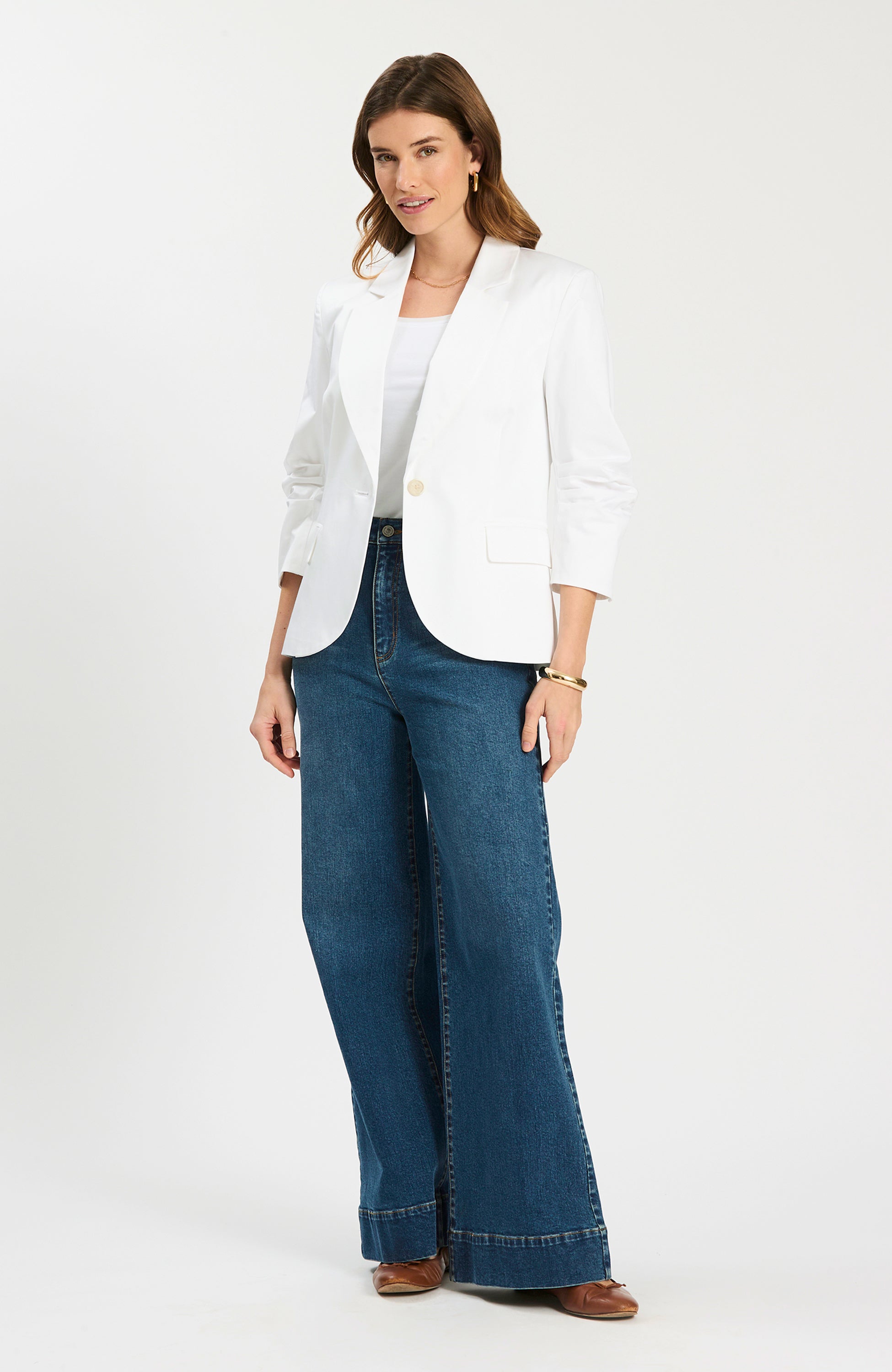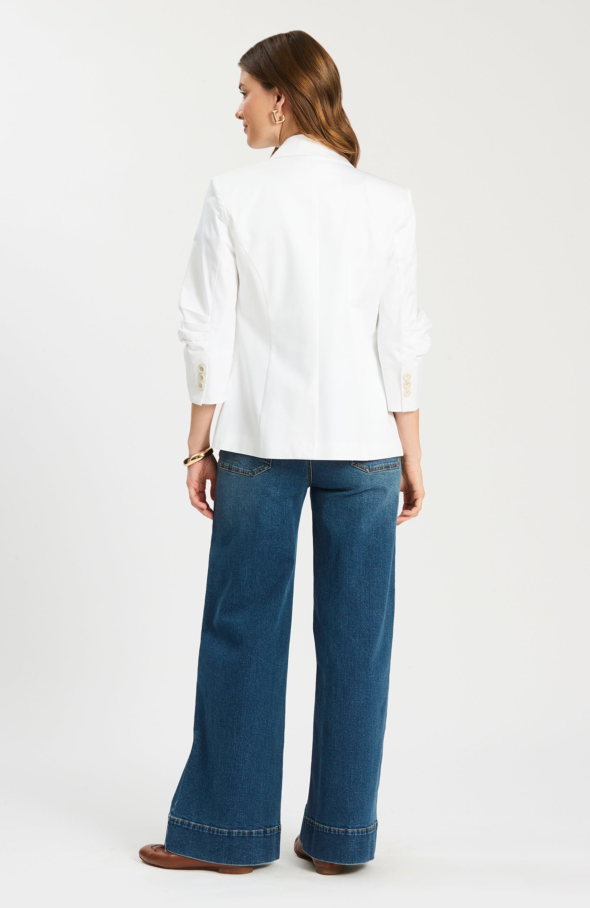 Suit up for spring: the Taylor Blazer brings a classic tailored look with warm-weather ease. Designed with a notch collar, single-breasted button front, and three-quarter ruched sleeves, it layers effortlessly over tees, dresses, and everything in between.
