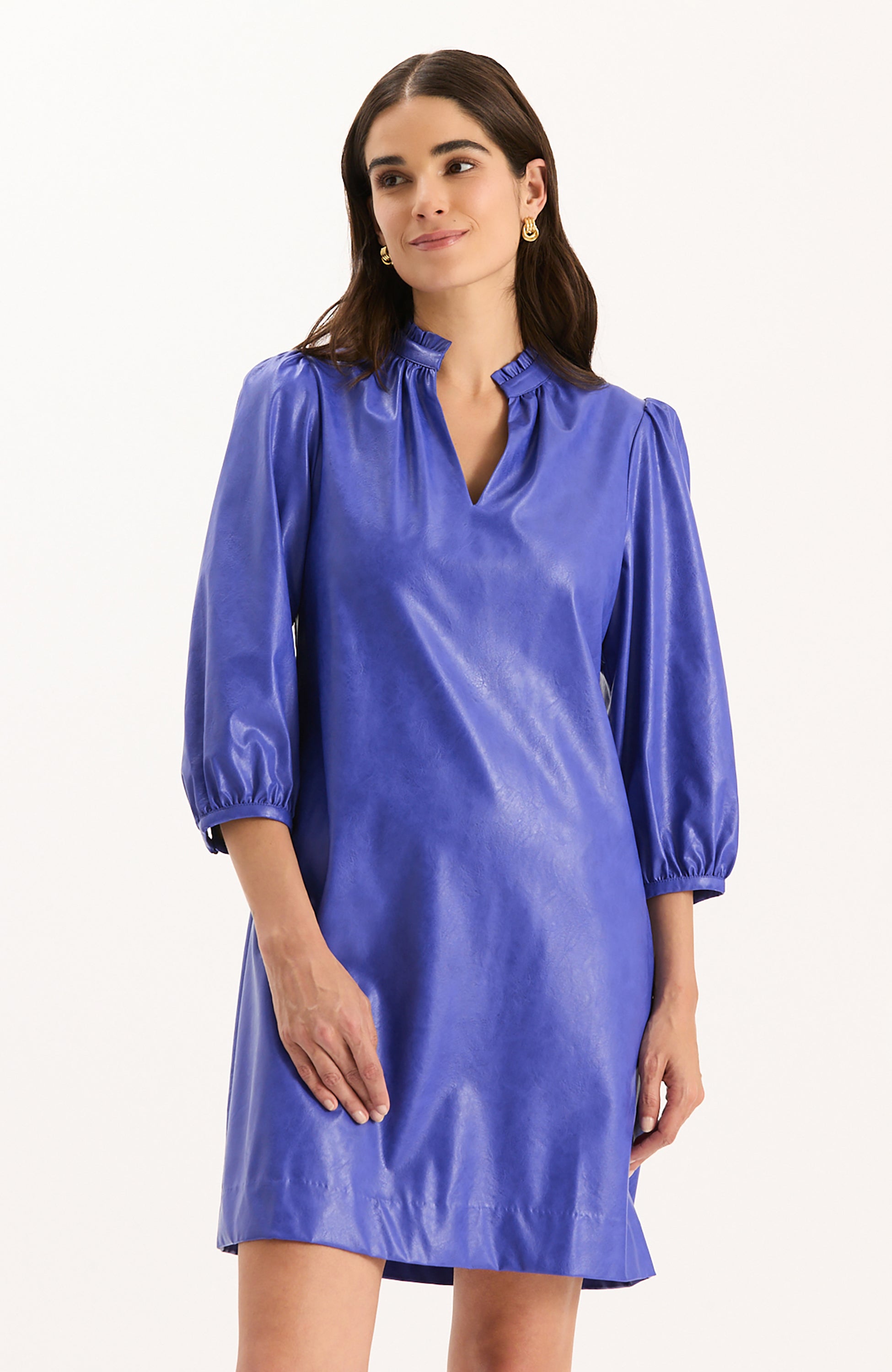 Our customer-favorite returns in all new colors, perfect for the season ahead. The Sherri Vegan Leather Dress combines sleek sophistication with feminine details, crafted from smooth vegan leather for an elevated look and feel. Its flattering A-line silhouette features a notched v-neckline, subtle puff shoulders, and three-quarter sleeves—balancing modern edge with timeless style. Whether dressed up with heels or worn casually with boots, this versatile piece makes an instant statement.
