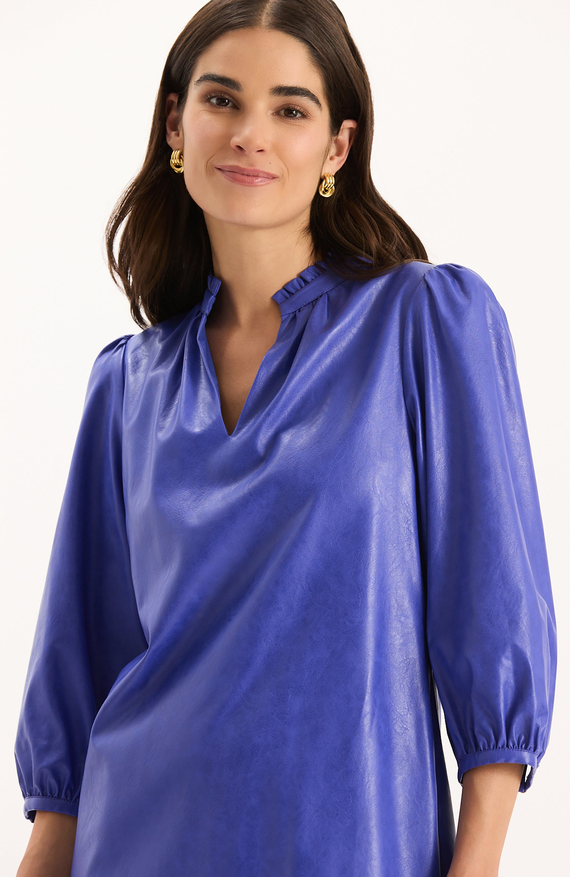 - Three-quarter sleeves with subtle puff shoulder